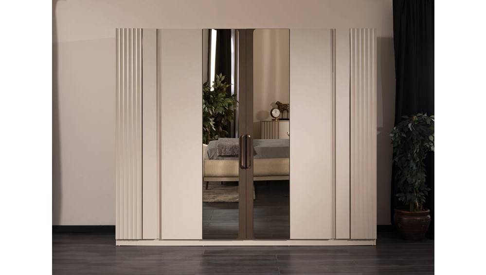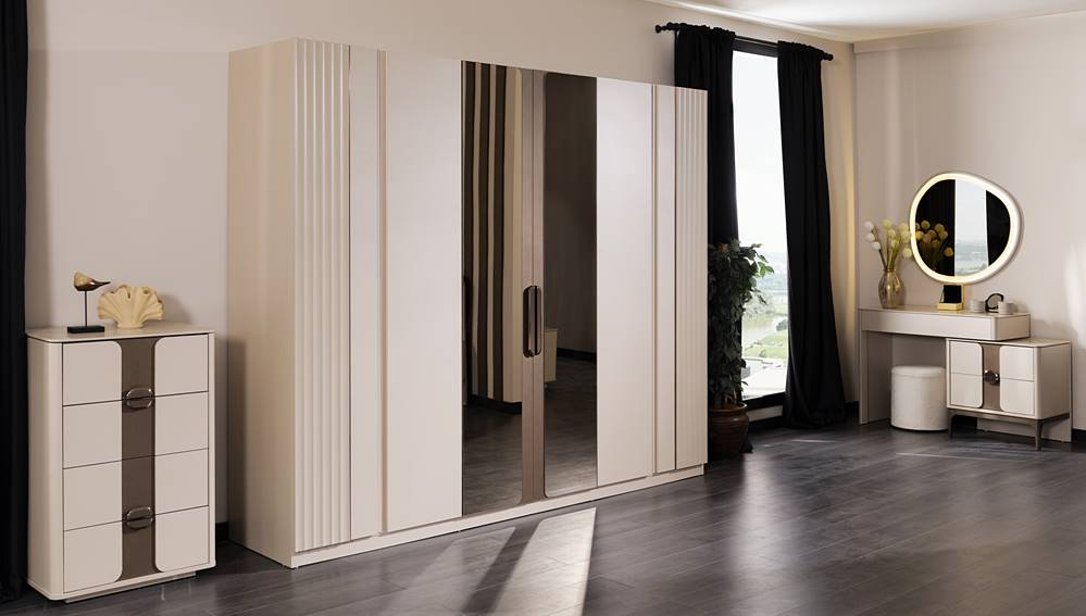 Fiyata Dahil Olan Parçalar: 6 Kapaklı Gardolap, Başlıklı Karyola, Aynalı Şifonyer, ve 2 Komidin.