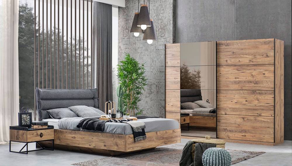 Sürgülü dolap, başlıklı karyola, aynalı şifonyer ve 2 ad. komodin